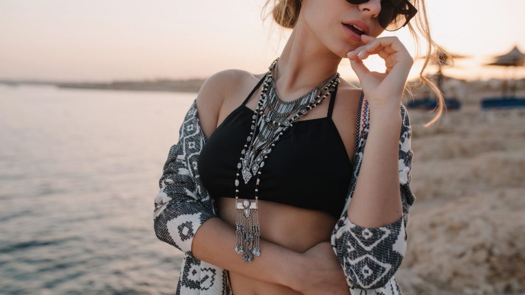 - Espacio visual: si tu escote es muy pronunciado, trabaja con collares más espaciados y no uses gargantilla.