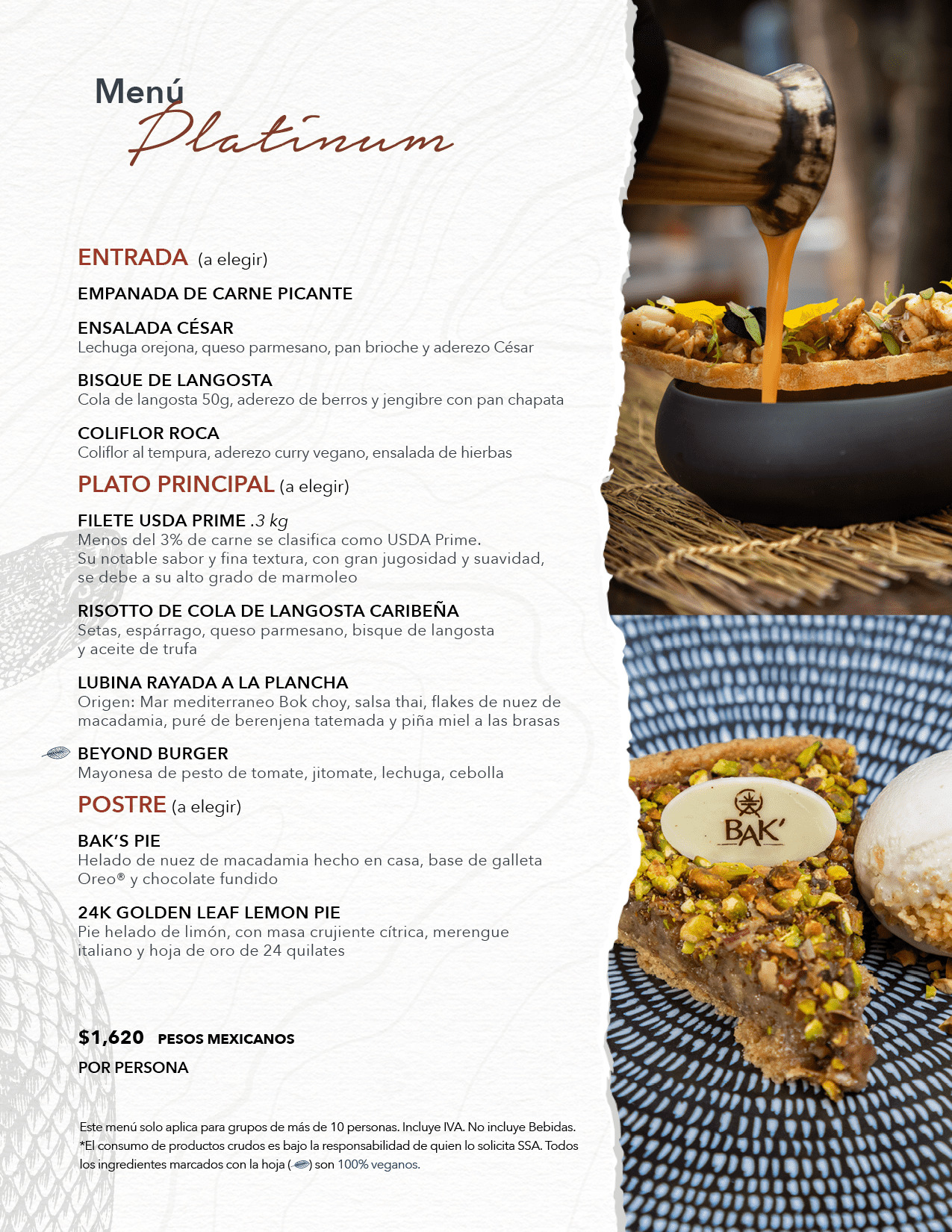 El menú de BAK’ es una experiencia gastronómica que celebra la excelencia y la creatividad. Destaca por su selección de cortes de carne de clase mundial, como el exclusivo Wagyu y el Black Angus Jack’s Creek, cuidadosamente seleccionados para ofrecer un sabor incomparable. Además, sus joyas del mar presentan mariscos frescos y de la más alta calidad creando una experiencia culinaria única y sofisticada.